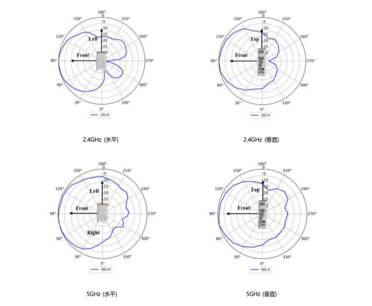 2、组合2.4GHz 或 5GHz 所有天线后,等效天线增益 :2.4GHz: 3dBi, 5GHz:3dBi。